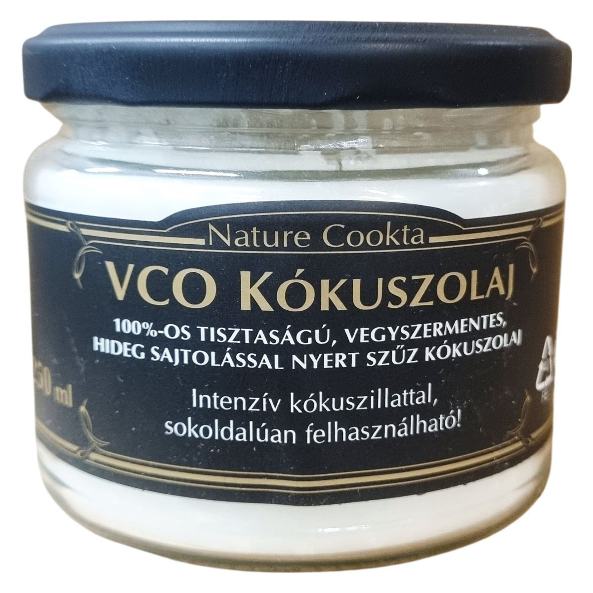 A Nature Cookta VCO kókuszolaj 100%-os tisztaságú, hideg sajtolással előállított szűz kókuszolaj, mely vegyszermentes és intenzív kókuszillattal rendelkezik. A termék 250 ml-es kiszerelésben kapható, és a minőségét a csomagoláson jelzett időpontig őrzi meg. A forgalmazó a Lechner és Zentai Kft., székhelye Budapesten található. A termék elérhető és további információk kérhetők a www.naturecookta.hu oldalon vagy az info@naturecookta.hu e-mail címen.