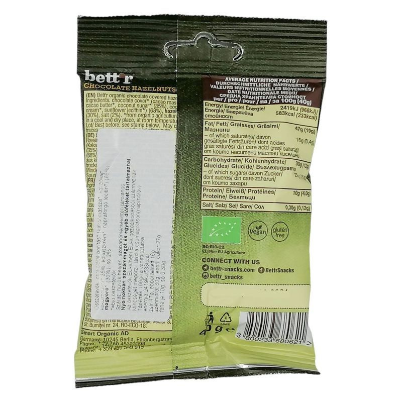 Összetevők: csokoládé bevonat* (kakaómassza*, kakaóvaj*, kókuszcukor* (35%), kókuszkrém*,napraforgó lecitin*) (68%), törökmogyoró* (30%), só (2%). *összetevők biogazdálkodásból.