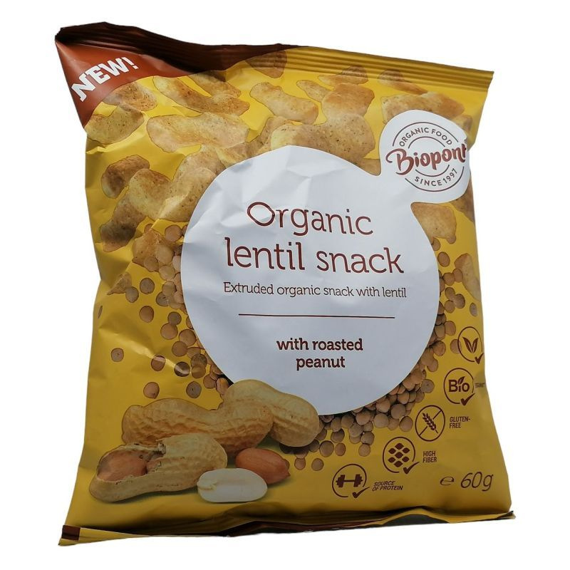 A lencse és földimogyoró kombinációja fehérjében gazdag, bio minőségű, extrudált ropogtatnivalót eredményez.