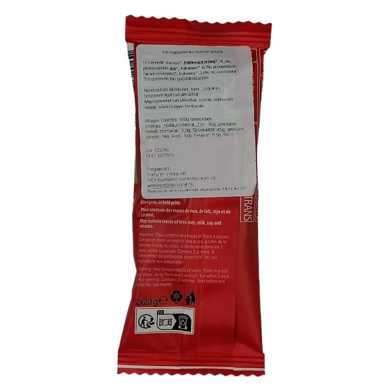 Összetevők: datolya*, földimogyoróvaj* 24,8%, gluténmentes zab*, kakaópor* 6,7%, prebiotikum(agavé inulinpor)*, kakaóvaj* 2,6%, só, vaníliaolaj*. *Összetevők bio gazdálkodásból