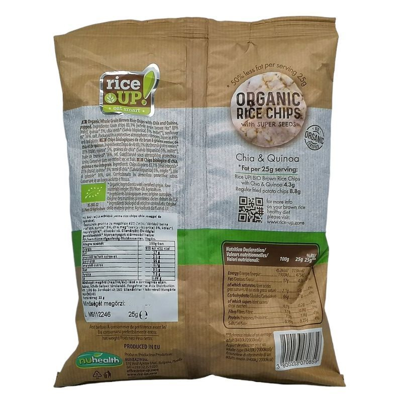 Bio, teljes kiőrlésű barna rizs chips chia maggal és quinoával.