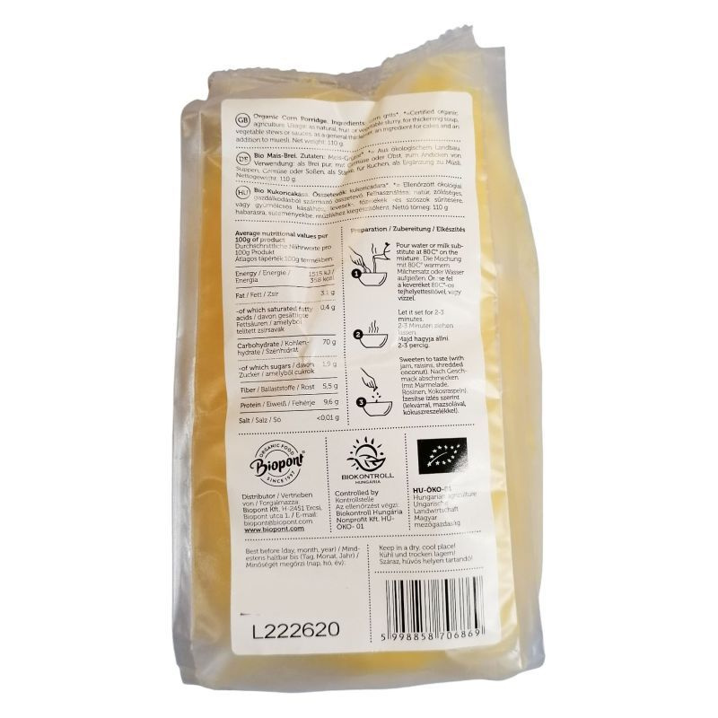 A bio kukoricakása felhasználható levesek, főzelékek és szószok sűrítésére, habarásra, süteményekbe, müzlibe vagy fogyasztható önállóan kásaként.