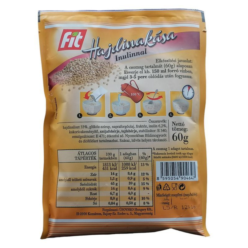 Összetevők: hajdinaliszt 33%, glükóz-szirup, részben hidrogénezett szójaolaj, fruktóz, inulin 6,2% kukoricakeményítő, szójafehérje, tejfehérje, stabilizátor: E 340; emulgeálószer: E 471; étkezési só. Nyomokban földimogyorót és dióféléket tartalmazhat.