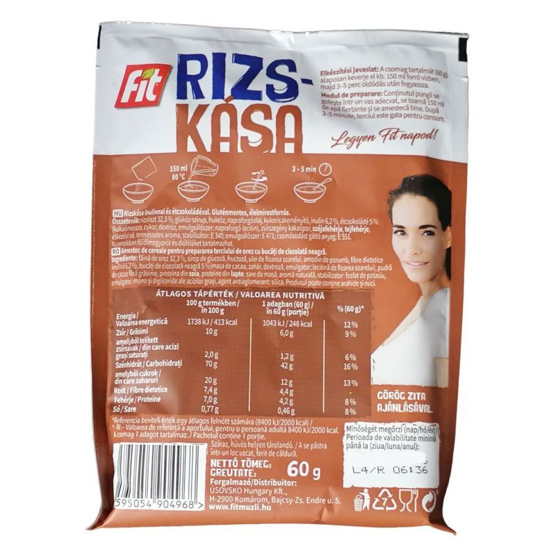 Összetevők: rizsliszt 32,3%, glükóz-szirup, fruktóz, részben hidrogénezett szójaolaj, kukoricakeményítő, inulin 6,2%, étcsokoládé 5% (cukor, kakaómassza, dextróz, emulgeálószer: szójalecitin), zsírszegény kakaópor, szójafehérje, tejfehérje, étkezési só, természetes aroma, stabilizátor: E 340; emulgeálószer: E 471; csomósodást gátló anyag: E 551. Nyomokban földimogyorót és dióféléket tartalmazhat.