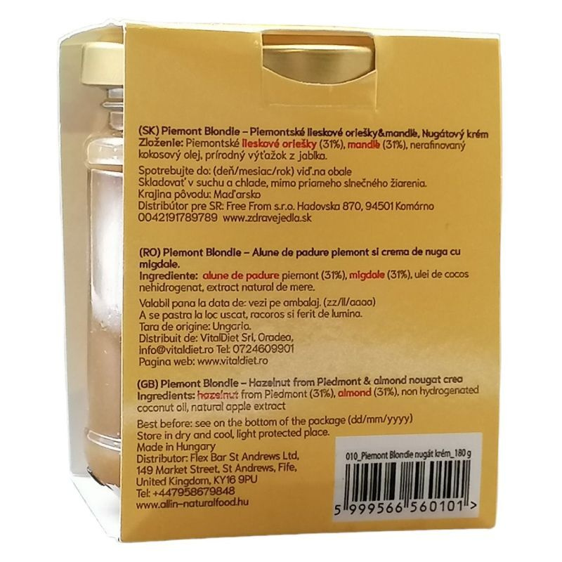 Összetevők: piemonti törökmogyoró, mandula, nem hidrogénezett kókuszolaj, természetes almakivonat.