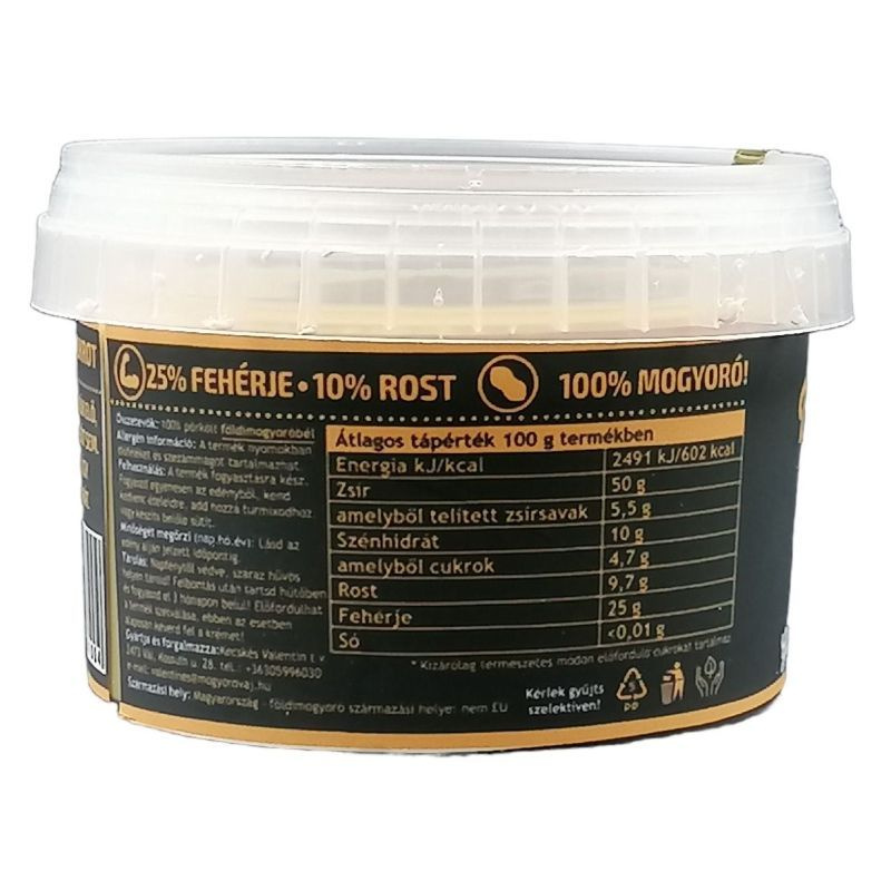A mogyoróvaj pörkölt földimogyoróból készül, hozzáadott cukor nélkül, sima, kenhető állaggal.