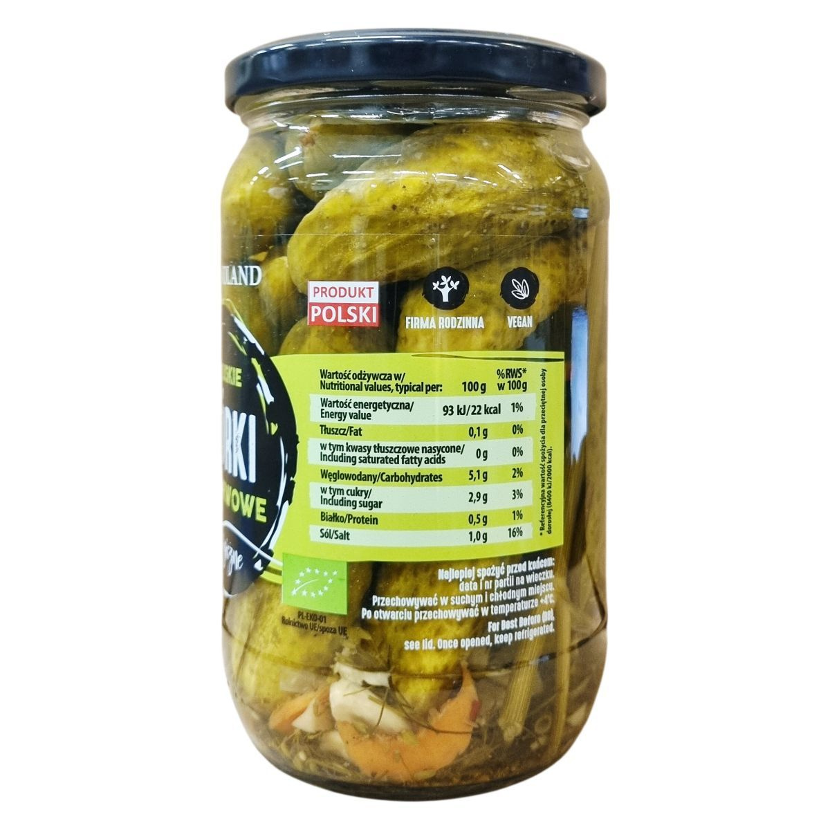 A termék Lengyelországban készült organikus összetevőkből, többek között bio uborkából, vízből, ecetből, paprikából, nádcukorból, hagymából, sóból, répából, tormából, kaporból, fokhagymából, fűszerekből (mint a mustár), melyeket tartósításhoz pasztőrözéssel kezeltek. Nettó súlya 670 g, a szűrt tömeg 360 g. A termék megfelel az Európai Unió ökológiai gazdálkodás szabályainak (PL-EKO-01) és vegán, valamint bio minősítésű. Ideális olyan fogyasztók számára, akik egészségtudatosan táplálkoznak, allergénmentesen vagy speciális étrendet követnek. Felbontás után ajánlott hűtőszekrényben tárolni, és száraz, hideg helyet igényel eredeti csomagolásban.