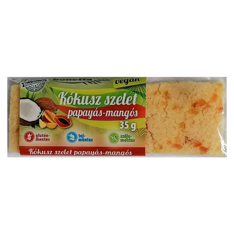 A szelet kókuszreszelékkel, szárított papayával és mangóval készül, vegán összetevőkből.