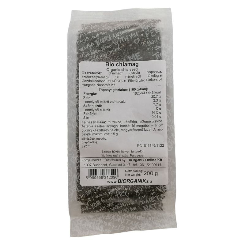 Biorganik bio chia mag fekete magas az Omega-3 zsírsav tartalma (15 g chia mag annyi Omega-3 zsírsavat tartalmaz, mint 250 g lazac) növényi termék, így koleszterinmentes, gazdag oldhatatlan (több mint 30%) és oldódó (5-6%) rostokban egyaránt, telített zsírsav tartalma nagyon alacsony, proteinben gazdag, és a 8 esszenciális aminosav mellett további aminosavakat is tartalmaz, kiváló antioxidáns forrás, még az áfonyánál is több antioxidánst tartalmaz, magas ásványi anyag tartalma van: kalcium, magnézium, vas, cink, A-, és B-vitaminok, réz, kálium, felhasználása széleskörű lehetőségeket kínál a mindennapi egészséges táplálkozásban, könnyen emészthető.
