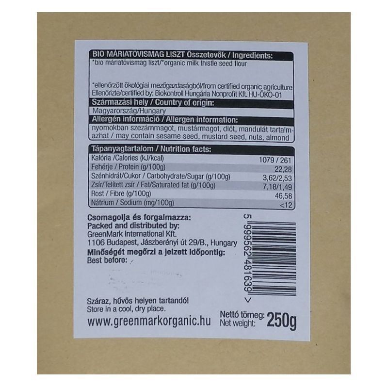 A máriatövismag liszt bio minőségű, magas rosttartalommal és természetes májvédő hatóanyaggal.