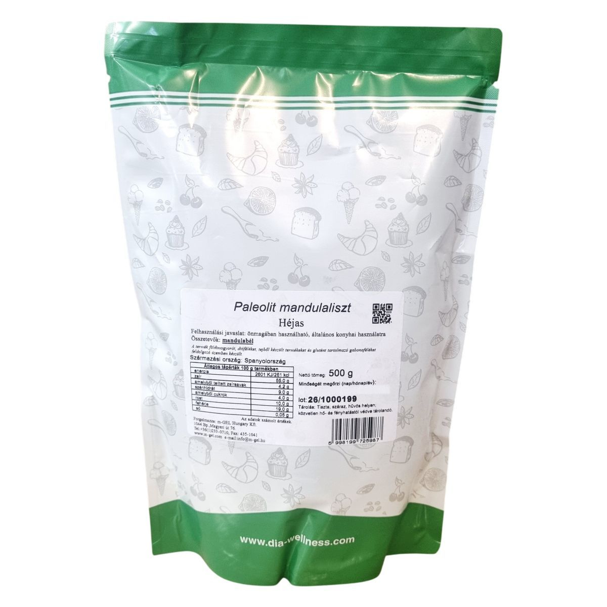 A Paleolit mandulaliszt héjas mandulából származik, származási országa Spanyolország. Nettó tömege 500 gramm, és praktikus kiszereléssel rendelkezik. A termék energiatartalma és tápértékei számolt értékek, amelyek segítségével hatékonyan beilleszthető különböző étrendekbe. A csomagolás tartalmazza a lot számot a könnyebb azonosítás érdekében. Az internetes elérhetőség és további információ a forgalmazó honlapján hozzáférhető.
