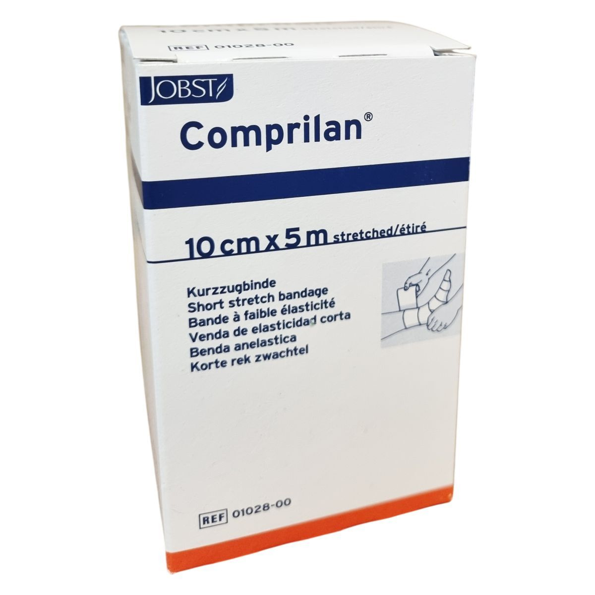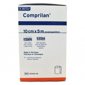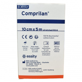A JOBST Comprilan® kompressziós pólya rövid megnyúlású és 10 cm széles, 5 méter hosszú textilpólya, amely 100% pamutból készült, latexmentes, így biztonságos használatot biztosít. Orvosi eszköz kategóriába tartozik, amely a vénás és nyirokrendszeri problémák kezelését támogatja. A terméket Németországban gyártják, és szobahőmérsékleten, száraz, napfénytől védett helyen kell tárolni. A csomagoláson található további információ a termék méretéről és gyártási adatairól.