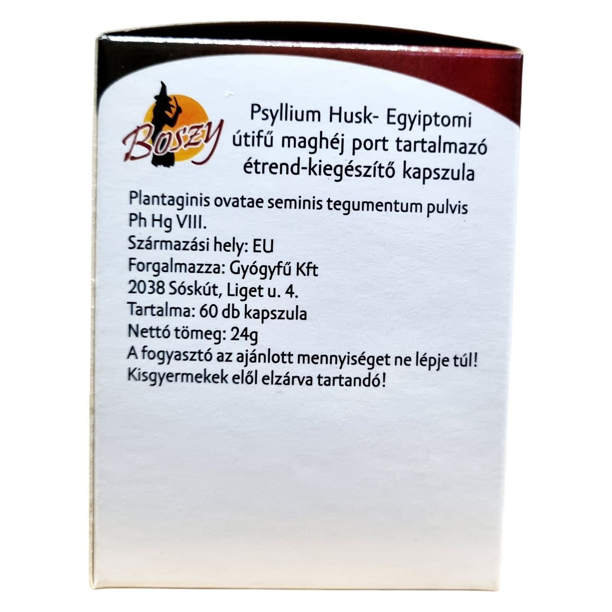 A Boszey Psyllium Husk kapszula egy étrend-kiegészítő, amely egyiptomi útifű maghéj port tartalmaz. A termék 60 db kapszulát tartalmaz, nettó tömege 24g. Az egyiptomi útifű maghéj hozzájárulhat az emésztőrendszer megfelelő működéséhez. A termék származási helye az EU, és a Gyógyfű Kft forgalmazza. Fontos, hogy a termék nem helyettesíti a kiegyensúlyozott étrendet és az egészséges életmódot. A fogyasztók számára ajánlott, hogy ne lépjék túl az ajánlott napi mennyiséget, és tartsák távol a terméket kisgyermekektől.