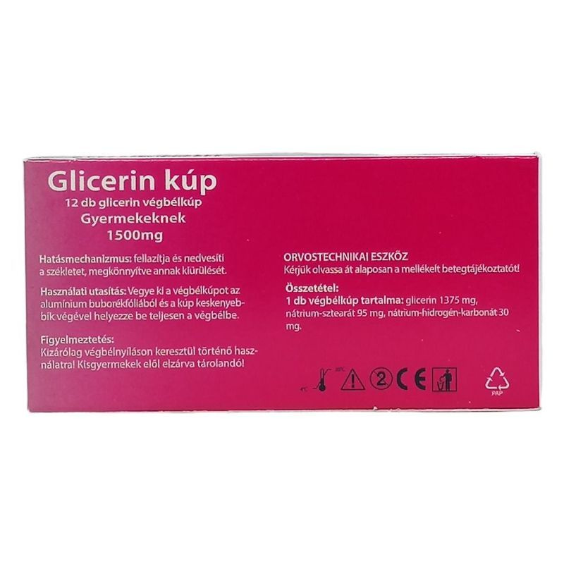 Használati utasítás: vegye ki a végbélkúpot az alumínium buborékfóliából és a kúp keskenyebbik végével helyezze be teljesen a végbélbe. Figyelmeztetés: kizárólag végbélnyíláson keresztül történő használatra! Kisgyermekek elől elzárva tartandó! Összetétel: 1 db glicerin kúp tartalma: glicerin: 1375 mg, nátrium-sztearát: 95 mg, nátrium-hidrogén-karbonát: 30 mg. Orvostechnikai eszköz.