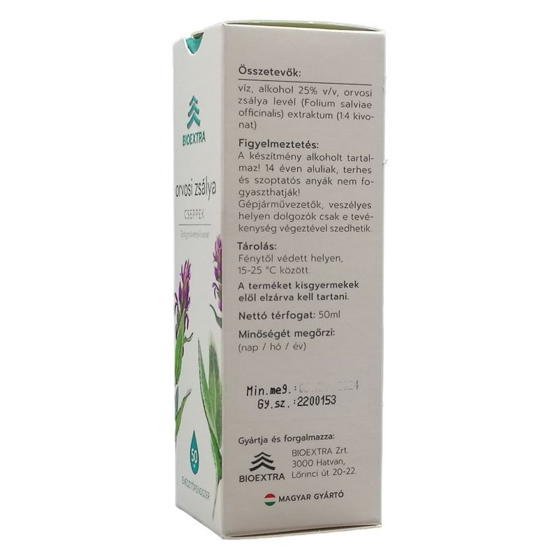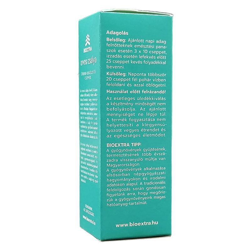 Orvosi zsálya levél vizes-alkoholos kivonata, étrend-kiegészítő készítmény. Az orvosi zsálya csepp nyugtató, emésztést segítő (epehajtó és görcsoldó), valamint izzadáscsökkentő hatású készítmény. Összetevők: Víz, etilalkohol, folium salviae officinalis (orvosi zsálya levél) extraktuma. Hatóanyag 1 egységben (1kapszula / 1tabletta / folyadékok teljes mennyisége): folium salviae officinalis (orvosi zsálya levél) extraktuma 1,8 g. Hatóanyag a napi adagban: 30 csepp = 46 mg kivonat. Notifikációs szám: 5801/2009