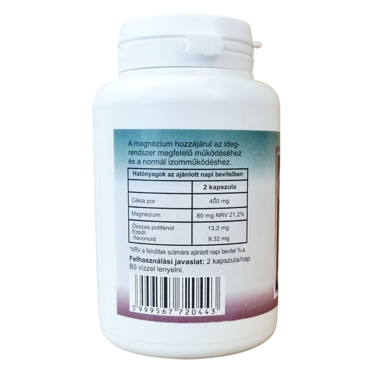 Cékla port tartalmazó étrend-kiegészítő kapszula polifenol tartalommal. Nettó tömeg: 62 g (100 x 620 mg). A magnézium hozzájárul az idegrendszer megfelelő működéséhez és a normál izomműködéshez.