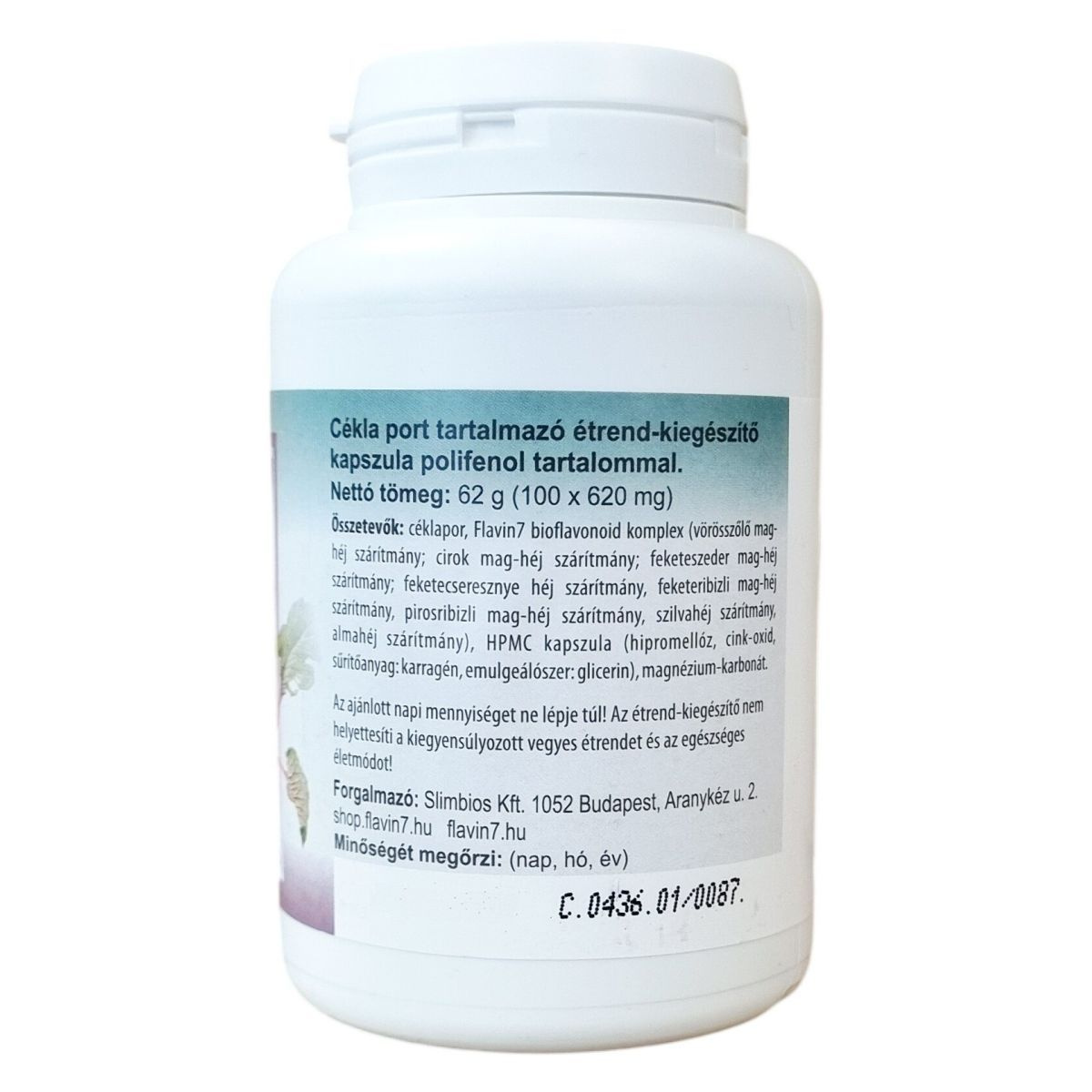 céklapor, Flavin7 bioflavonoid komplex (vörösszőlő mag-héj szárítmány; cirok mag-héj szárítmány; feketeszeder mag-héj szárítmány; fekete cseresznye héj szárítmány; feketeribizli mag-héj szárítmány; pirosribizli mag-héj szárítmány; szilvahéj szárítmány; almahéj szárítmány), HPMC kapszula (hipromellóz, cink-oxid, sűrítőanyag: karragén, emulgeálószer: glicerin), magnézium-karbonát