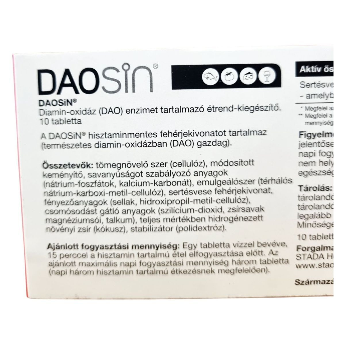 Az alkohol és egyes gyógyszerek gátolhatják a DAO-enzim aktivitását. Az étrend-kiegészítő nem helyettesíti a kiegyensúlyozott, vegyes étrendet és az egészséges életmódot. Kisgyermekektől elzárva tartandó. Az ajánlott napi mennyiséget ne lépje túl.