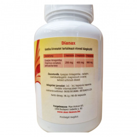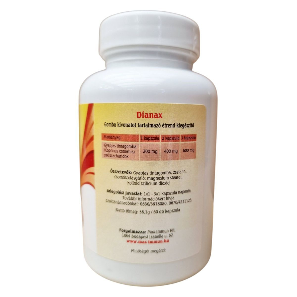 A Dianax étrend-kiegészítő a Max-Immun Kft. terméke, amely gyapjas tintagomba kivonatot tartalmaz. A termék poliszacharid tartalma miatt hozzájárulhat az immunrendszer támogatásához. A kapszulák adagolása rugalmasan igazítható az egyéni szükségletekhez, napi 1-3 kapszula fogyasztása javasolt. A termék összetevői között megtalálható a zselatin, valamint csomósodásgátló anyagok, mint a magnesium stearat és a kolloid szilícium dioxid. Fontos, hogy az étrend-kiegészítő nem helyettesíti a vegyes étrendet és az egészséges életmódot, és kisgyermekek elől elzárva tartandó. A terméket száraz, hűvös helyen, nedvességtől óvva kell tárolni.