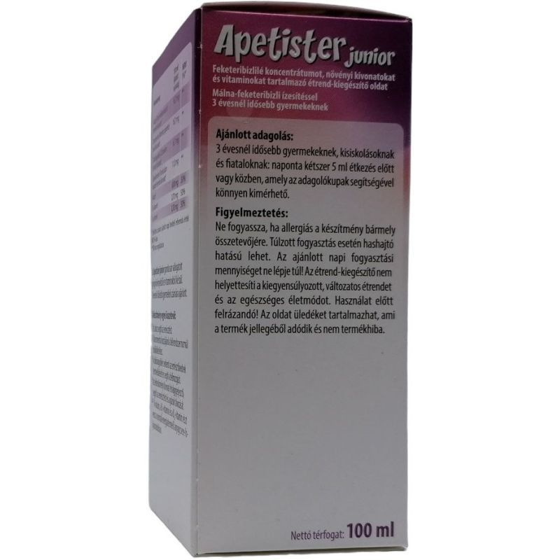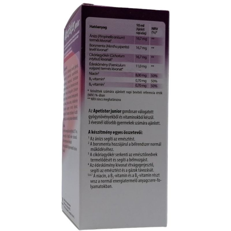 Az Apetister junior összevetőiből az ánizs segíti az emésztést, a borsmenta hozzájárul a bélrendszer normál működéséhez, a cikóriagyökér serkenti az emésztőnedvek termelődését és segíti a bélmozgást. Az oldat édeskömény kivonatot is tartalmaz, mely étvágygerjesztő, segíti az emésztést és a gázok távozását. A niacin, a B2-vitamin és a B6-vitamin összetevői a normál energiatermelő anyagcsere-folyamatokat is támogatják.