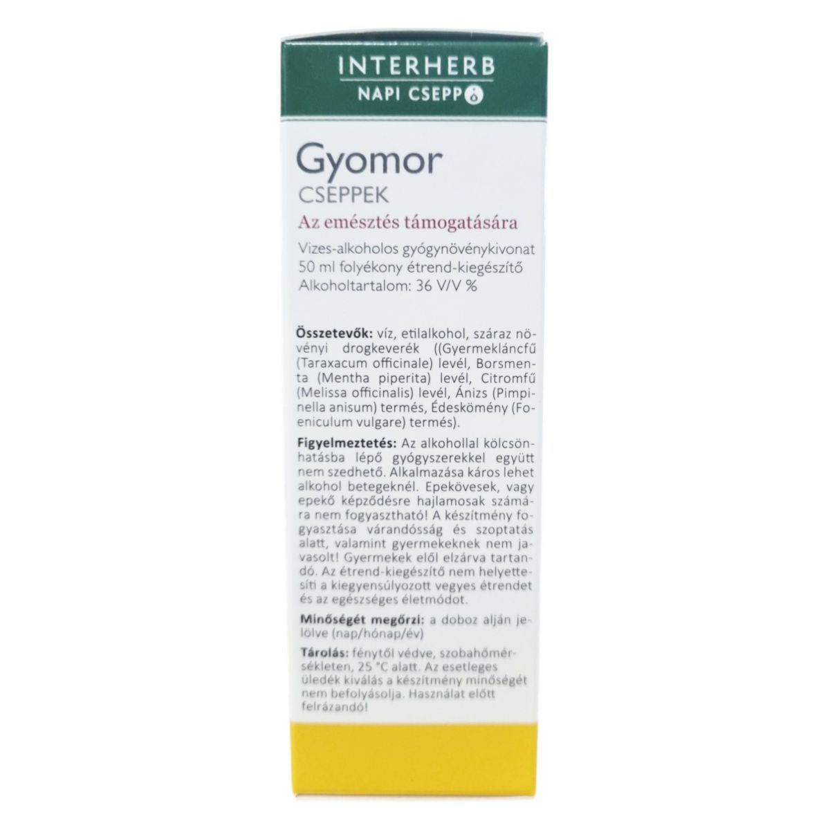 Az INTERHERB NAPI CSEPP Gyomor Cseppek egy vizes-alkoholos gyógynövénykivonat, amely 36 V/V % alkoholt tartalmaz. A termék célja az emésztés támogatása, és a benne található gyógynövények, mint a gyermekláncfű, borsmenta, citromfű, ánizs és édeskömény, hozzájárulhatnak a normál bélműködéshez és az emésztés megőrzéséhez. A termék használata előtt fontos figyelembe venni a figyelmeztetéseket, különösen az alkoholtartalom miatt.