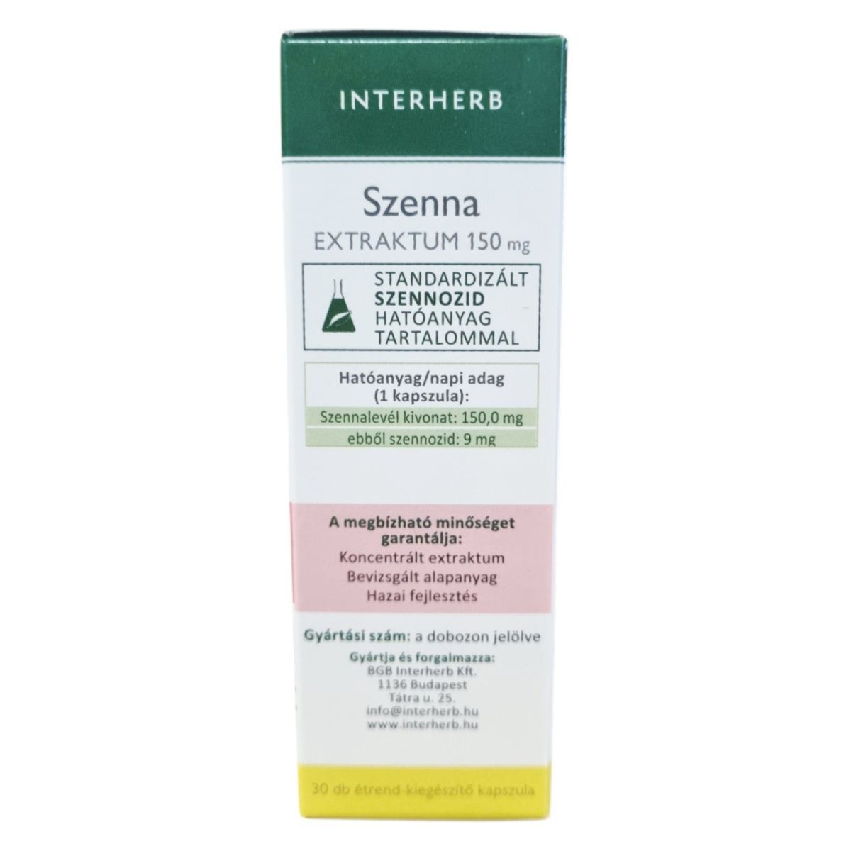 Az INTERHERB Szenna EXTRAKTUM 150 mg kapszula a megfelelő bélműködés támogatására szolgálhat. A termék standardizált szennozid hatóanyag tartalommal rendelkezik, amely hozzájárulhat a normál bélmozgás elősegítéséhez. A szennalevél kivonat szerepe lehet az emésztési komfortérzet kialakításában, különösen az egyoldalú étkezés és a mozgásszegény életmód esetén. A termék koncentrált extraktumot tartalmaz, bevizsgált alapanyagokból készül, és hazai fejlesztés eredménye. A gyártási szám a dobozon van feltüntetve, és a minőségét a doboz alján jelzett ideig őrzi meg.