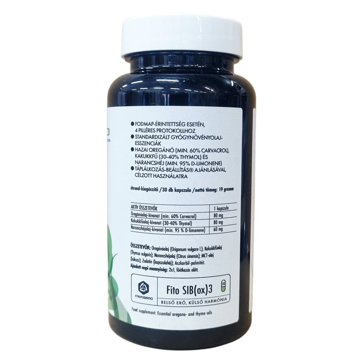 A Fito SIB(ox) 3 kapszula oregánó-, kakukkfű- és narancshéjolaj-kivonatot tartalmaz, amelyek hozzájárulhatnak az emésztőrendszer támogatásához és a vitalitás megőrzéséhez.