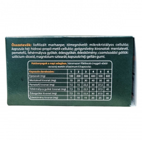 liofilizált marhaepe, mikrokristályos cellulóz, hidroxi-propil-metil-cellulóz, mentalevél kivonat, pemetefű kivonat, fehérmályva gyökér kivonat, édesgyökér kivonat, édeskömény kivonat, szilicium-dioxid, magnézium-sztearát, gellán gumi