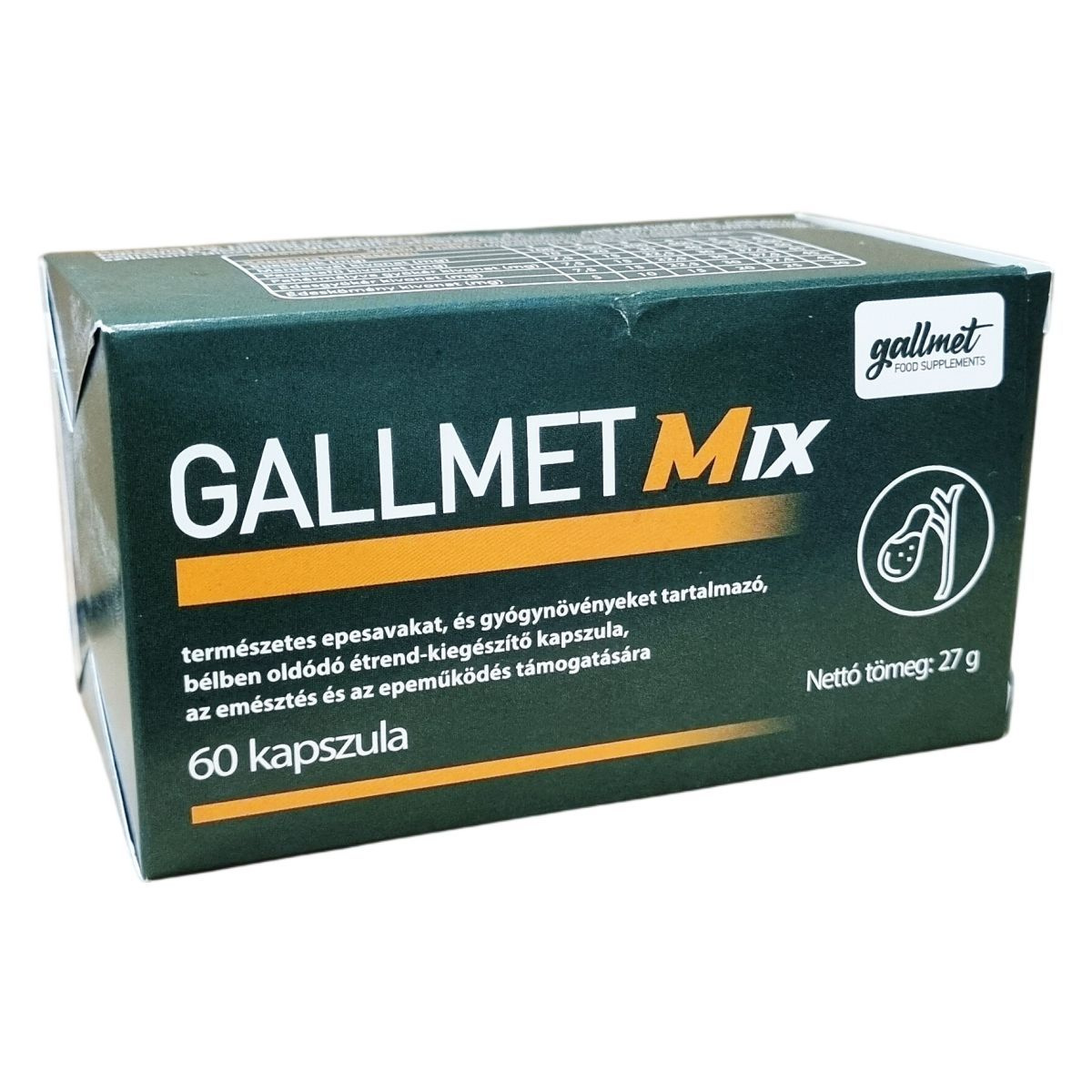 A Gallmet Mix kapszula természetes epesavakat és többféle gyógynövényt tartalmaz, amelyek bélben oldódó formában segíthetik az emésztést és az epeműködést. A kapszula hatóanyagai között szerepel a borsmenta, amely hozzájárulhat a puffadás csökkentéséhez, valamint a fehér mályva, amely támogatja a gyomor- és bélrendszer normál működését. Az orvosi pemetefű segítheti a béltraktus ellazulását és hozzájárulhat az egészséges emésztéshez, továbbá a máj és az epe normál működéséhez. Az édesgyökér az emésztőrendszer normál működését támogathatja, míg az édeskömény hozzájárulhat az egészséges emésztés fenntartásához. A terméket a nemzetközi WESSLING laboratórium mikrobiológiai, szennyezőanyag-, nehézfém-, rádióaktivitás-, doppingmentesség- és allergénvizsgálatokkal ellenőrizte, melyek eredménye a gyártó honlapján elérhető. A termék az EU területén készül, az elsődleges összetevők Németországból származnak, a gyártás és csomagolás az Egyesült Királyságban, Belgiumban és Magyarországon történik. Az étrend-kiegészítő nem helyettesíti a kiegyensúlyozott étrendet és az egészséges életmódot.