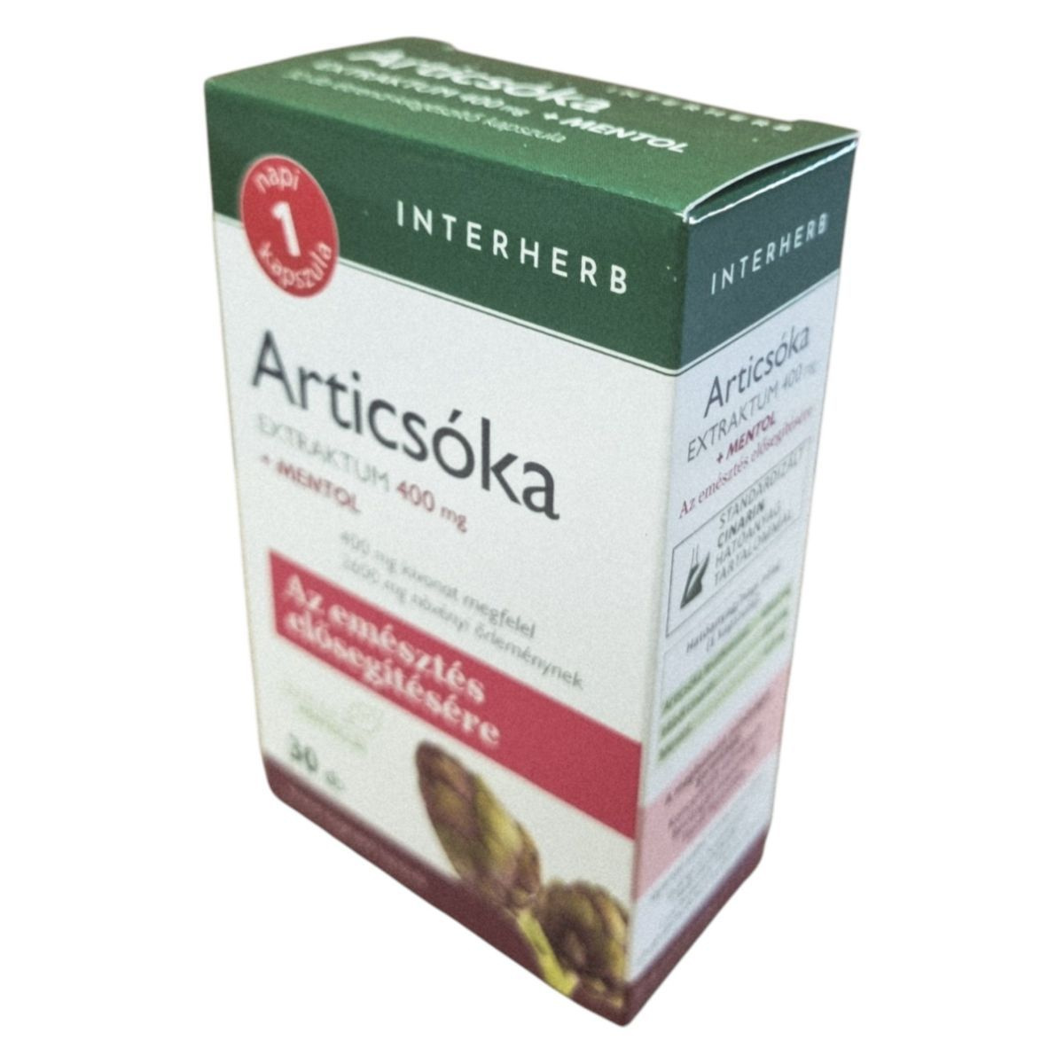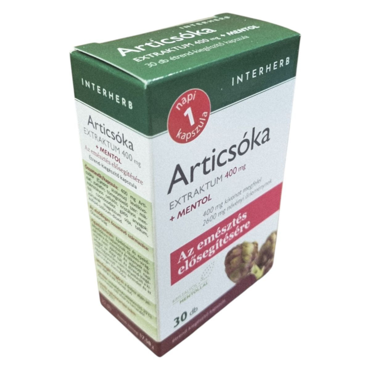 Az INTERHERB Articsóka EXTRAKTUM 400 mg + MENTOL kapszula az emésztés elősegítésére szolgálhat, különösen a helytelen táplálkozás és a nehéz, zsíros ételek fogyasztása esetén. Az articsóka hozzájárulhat a belek megfelelő működéséhez és a gyomor-bélrendszeri komfortérzethez. A termék standardizált cinarin hatóanyagot tartalmaz, amely elősegítheti az emésztőnedvek áramlását és a máj egészségének megőrzését. A mentollal kiegészített formula a diétás étrend kiegészítésére is ajánlott. Az elsődleges összetevő származása Olaszország.