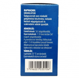 A RAPHACHOL granulátum egy gyógyszernek nem minősülő gyógyhatású készítmény, amelynek hatását népgyógyászati és szakirodalmi adatok igazolják. A termék egy 70 grammos granulátum, amely fekete retek préslé sűrítményéből nyert hatóanyagot tartalmaz, valamint olyan segédanyagokat, mint laktóz-monohidrát, szacharóz és keserű édeskömény termésolaj. A készítményt különféle emésztési panaszok, köztük teltségérzet és puffadás esetén, valamint az epetermelés fokozására és a jobb közérzet elősegítésére ajánlják. Az adagolás felnőttek és gyermekek számára is ajánlott, és javasolt főétkezések után bevenni megfelelő mennyiségű folyadékkal. A termék tárolása a 25 °C alatti hőmérsékletet igényli, és fontos, hogy gyermekek elől elzárva legyen.