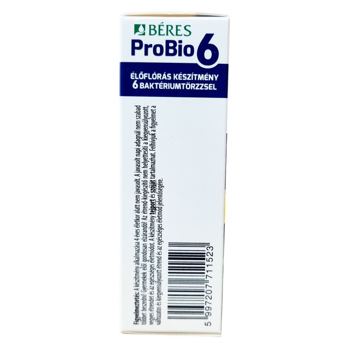 A Béres ProBio 6 kapszula olyan élőflórás étrend-kiegészítő, amely hatféle, az emberi bélflórában is megtalálható jótékony baktériumtörzset tartalmaz. A termék garantáltan legalább 5 milliárd élő baktériumot tartalmaz kapszulánként, ami 30 adagolást biztosít egy dobozban. Az összetevők között megtalálhatók a baktérium törzsek mellett a burgonyakeményítő, csomósodást gátló anyagok és antioxidáns. A terméket ajánlott 4 éves kor felett alkalmazni az ajánlott adagolási mennyiség szerint, és gyermekektől elzárva tárolni. A készítmény nem helyettesíti a kiegyensúlyozott étrendet és az egészséges életmódot, továbbá tartalmazhat tejport és szóját, ezért érdemes figyelembe venni allergén információkat. A termék tárolása során célszerű a megadott hőmérsékleti tartományt betartani a minőség megőrzése érdekében.