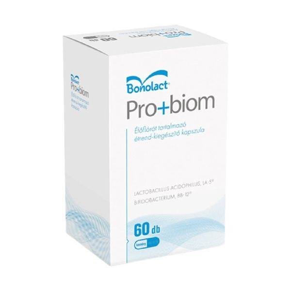 A 60 db-os Bonolact Pro+biom élőflórás étrend-kiegészítő kapszula Lactobacillus acidophilus LA-5® és Bifidobacterium animalis subsp. lactis BB-12® törzseket tartalmaz. A készítmény napi alkalmazás mellett támogathatja a bélflóra egyensúlyát. 3 éves kortól használható, kapszula formában vagy folyadékba keverve is fogyasztható. Alkalmas vegetáriánus és vegán étrendet követők számára is. Tárolása száraz, hűvös helyen ajánlott.