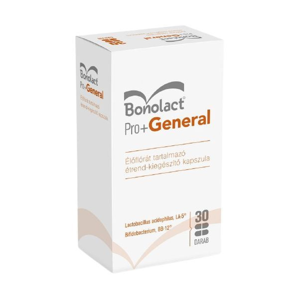 A 30 db-os Bonolact Pro+General kapszula élőflórát tartalmazó étrend-kiegészítő készítmény, amely Lactobacillus acidophilus LA-5® és Bifidobacterium animalis subsp. lactis BB-12® törzseket kombinál. A kapszulák alkalmazása hozzájárulhat a bélflóra egyensúlyának fenntartásához. Vegetáriánus és vegán étrendbe is illeszthető, 3 éves kortól alkalmazható. Antibiotikum-kezelés mellett való használata esetén legalább 3 óra eltéréssel javasolt bevenni. Nettó tömeg: 2,3 g.