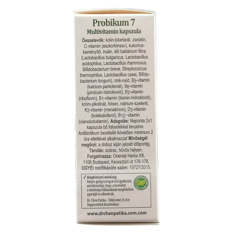 Élőflórát, inulint, vitaminokat és nyomelemeket tartalmazó speciális gyógyászati célra szánt tápszer. A Probikum7 élőflórás Multivitamin alkalmazása javasolt antibiotikus kezelést követően és bélrendszeri fertőzések után aktív baktériumok, egyes vitaminok és ásványi anyagok pótlására. Adagolás: Napi 2 x 1 szükség esetén 2 x 2 kapszula bőséges folyadékkal lenyelve, reggeli előtt és vacsora után.