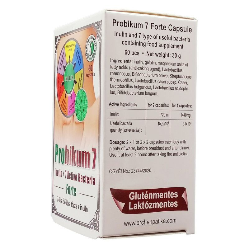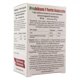 Hasznos baktériumokat és inulint tartalmazó készítmény. Az inulin természetes vízben oldódó rost emésztetlenül jut a vastagbélbe. A bélflóra egyensúlyzavara valószínűleg nem egyetlen baktériumtörzs számának megváltozása miatt következik be. Ilyenkor a több törzset is tartalmazó készítmény alkalmazása nagyobb sikerrel jár. A Probikum 7 Forte kapszula egyszerre tartalmazza a manapság leggyakrabban alkalmazott, a bélflórában is előforduló kedvező tulajdonságú baktériumokat.