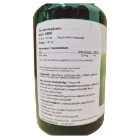 Az Aloe Vera étrend-kiegészítő kapszula formában érhető el, és 25 mg Aloe Vera kivonatot tartalmaz, amely 200:1 koncentrátumú, így megfelel 5 g friss Aloe zselének. A termék szójabab olajat, zselatint, glicerint, tisztított vizet, szilícium-dioxidot és méhviaszt is tartalmaz. Az ajánlott napi adag 1 kapszula, amely segíthet az általános jólét támogatásában. Fontos, hogy a terméket gyermekek elől elzárva, száraz és hűvös helyen tároljuk. A termék nem helyettesíti a vegyes étrendet és az egészséges életmódot.