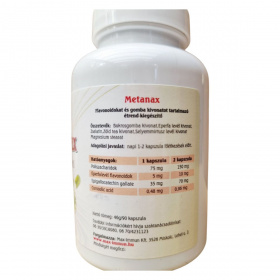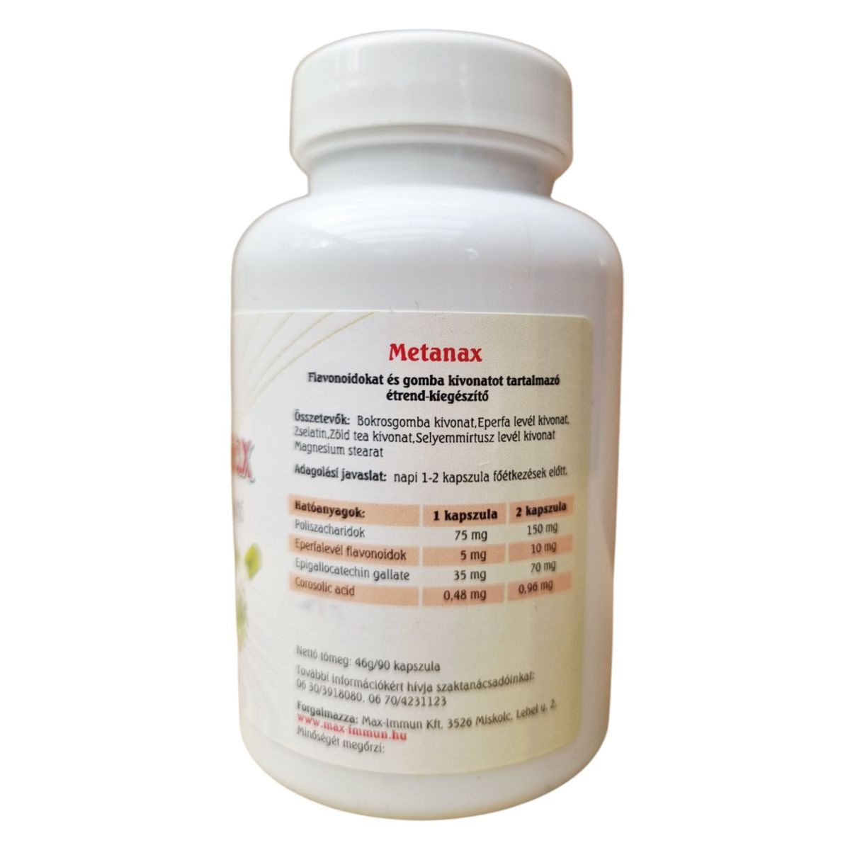 A Metanax étrend-kiegészítő flavonoidokat és gomba kivonatot tartalmaz, amelyek hozzájárulhatnak az egészség megőrzéséhez. A termék bokrosgomba és eperfa levél kivonatot tartalmaz, melyek különleges összetevői lehetnek a mindennapi étrendnek. Az ajánlott napi adag 1-2 kapszula, amelyet főétkezések előtt érdemes bevenni. A termék 90 kapszulát tartalmaz, és a Max-Immum Kft. forgalmazza. További információkért hívja szaktanácsadóinkat a megadott telefonszámokon.