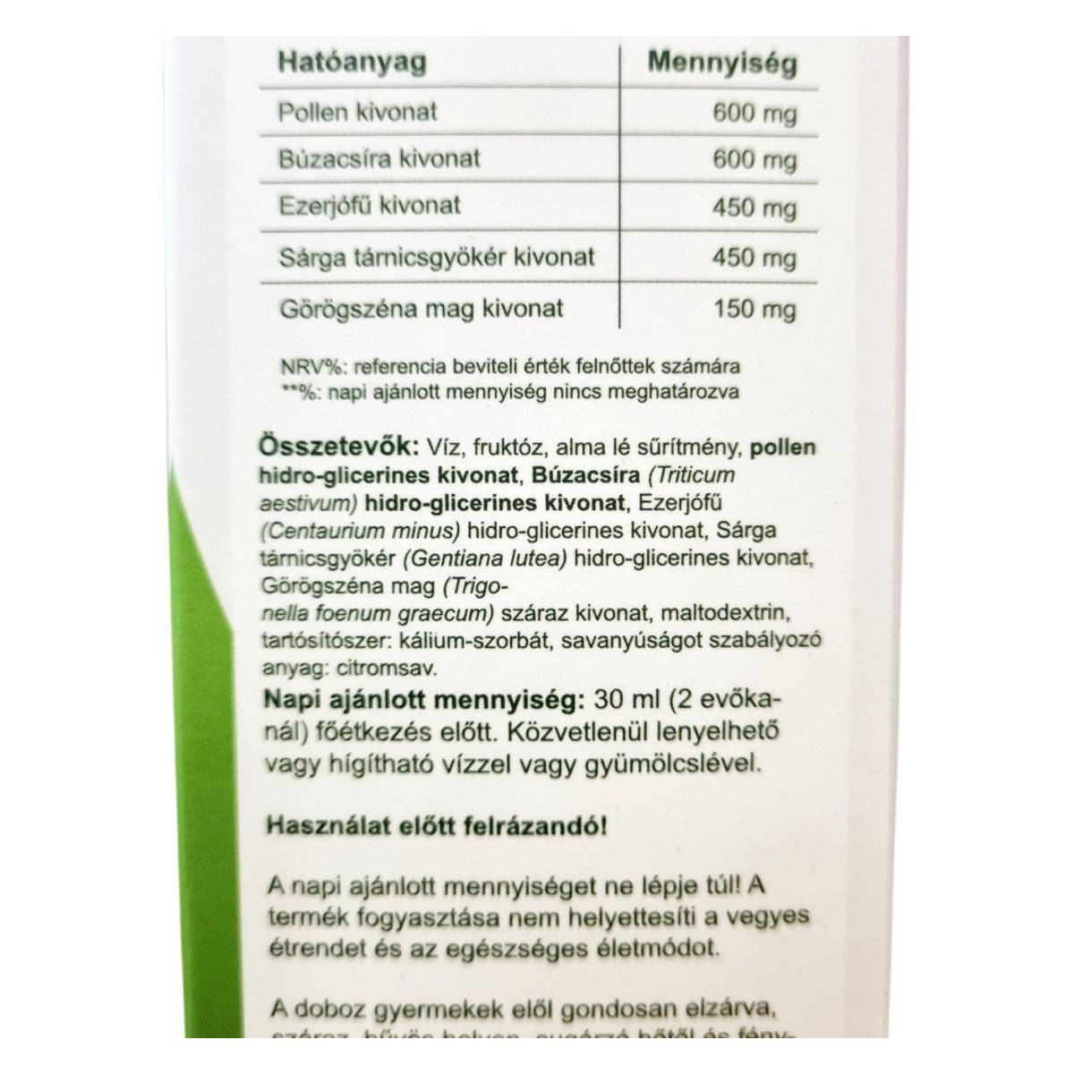 Víz, fruktóz, alma lé sűrítmény, pollen hidro-glicerines kivonat, Búzacsíra (Triticum aestivum) hidro-glicerines kivonat, Ezerjófű (Centaurium minus) hidro-glicerines kivonat, Sárga tárnicsgyökér (Gentiana lutea) hidro-glicerines kivonat, Görögszéna mag (Trigonella foenum graecum) száraz kivonat, maltodextrin, tartósítószer: kálium-szorbát, savanyúságot szabályozó anyag: citromsav.