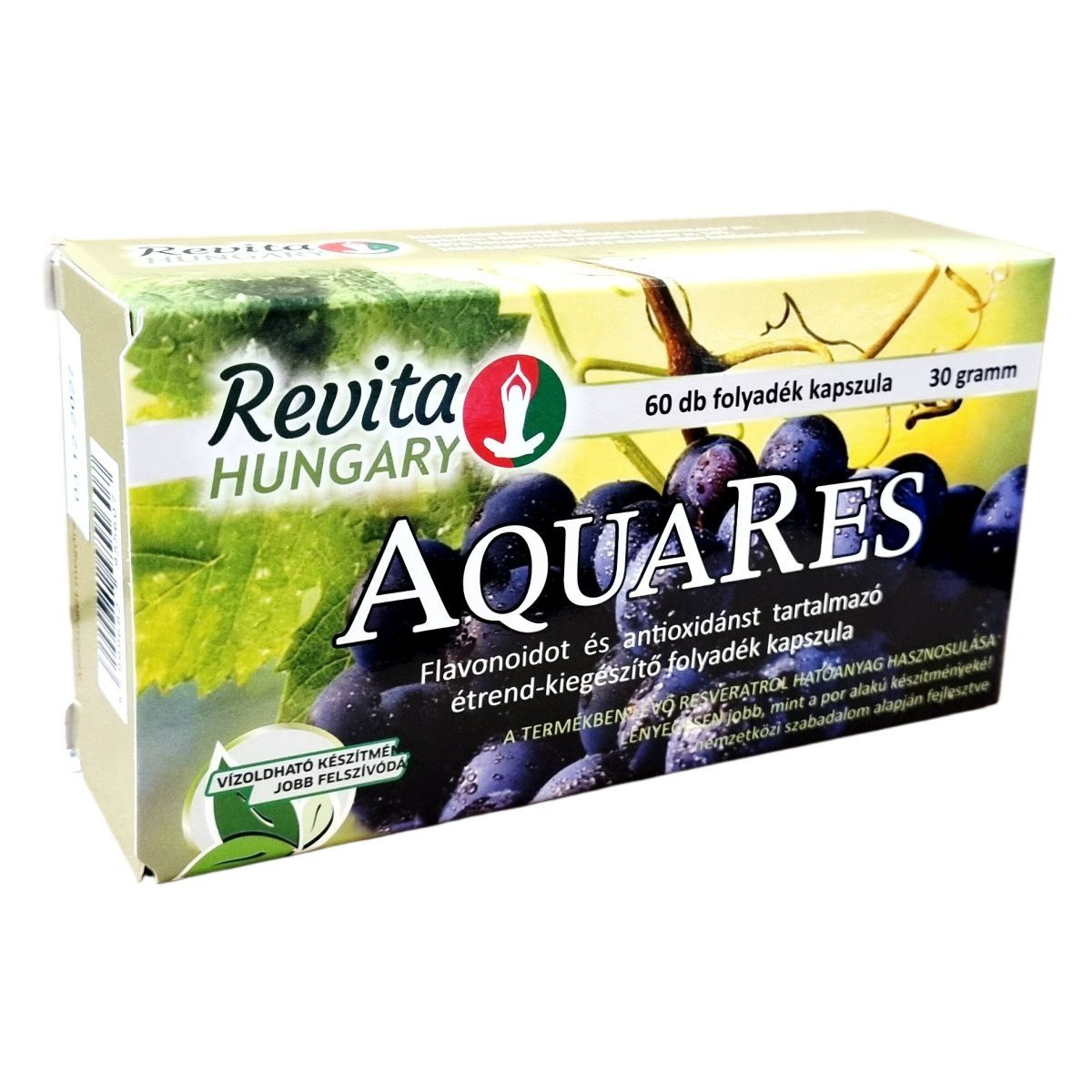A Revita HUNGARY által forgalmazott AQUARES egy flavonoidokat és antioxidánsokat tartalmazó étrend-kiegészítő folyadék kapszula, amely vízoldható formában készült, így jobban felszívódhat. A készítményben található resveratrol hatóanyag hasznosulása nemzetközi szabadalom alapján fejlesztett technológiával lényegesen jobb, mint a por alakú készítmények esetében. A kapszula napi két darabos adagjának összetevői között olajsav, resveratrol és C-vitamin (aszkorbinsav) szerepel, melyek a szervezet egészséges működését támogathatják. A termék kizárólag tisztán előállított összetevőket tartalmaz, és a tárolási körülményeket figyelembe véve megőrzi minőségét a dobozon feltüntetett időpontig.