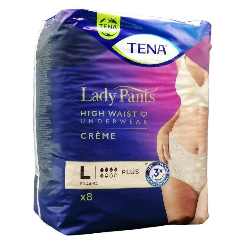 Tena Lady Pants Plus Creme inkontinencia-fehérnemű diszkrét krém színben és magasított derékrésszel, középsúlyos vizeletvesztési probléma esetére.
