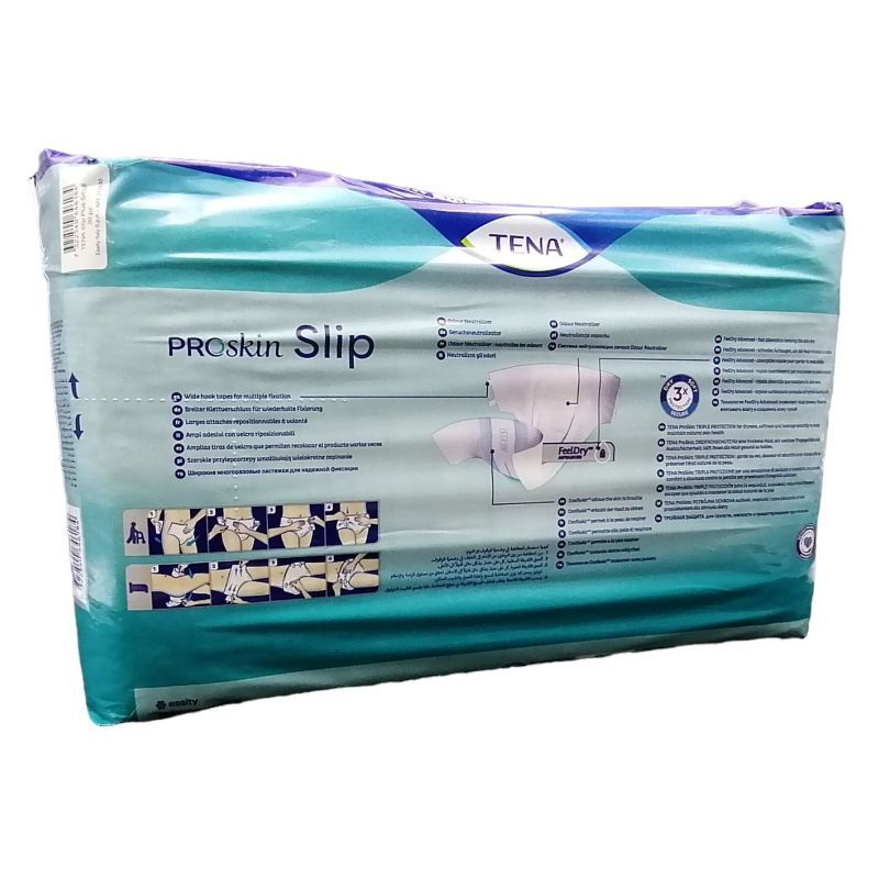 Más hagyományos felnőtt pelenkanadrágoktól eltérően a TENA ProSkin Slip egy puha, textilszerű anyagból készült, testhezálló kialakítású termék, amely jelentős biztonságot ad a szivárgás ellen. Korlátozottan mozgásképes személyeknek és ágyban végzett termékcseréhez ajánlott. A FeelDry Advanced funkciónak köszönhetően a termék gyorsan magába szívja a felületére került nedvességet, így szárazon tartja a bőrt. A nedvességet gyorsan megkötő mag hamar magába zárja az akár nagy mennyiségű vizeletet is, így szárazon tart, míg a teljesen légáteresztő ConfioAir hátoldalon keresztül jól tud szellőzni a bőr. A felsorolt funkciók hozzájárulnak a bőr természetes egészségi állapotának fenntartásához. A nyitott kialakításnak és az erős, öntapadó tépőzáraknak köszönhetően a termékcsere fekvő helyzetben is egyszerű, a már felhelyezett termék pedig kibontás után könnyen újrarögzíthető és újraigazítható a tökéletes, biztonságos illeszkedéshez. A frissességet a szagsemlegesítő rendszer és a nedvességjelző csík biztosítja - utóbbi jelzi, ha termékcserére van szükség.