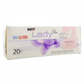 A légáteresztő, anatómiailag formált SENI LADY SLIM MICRO inkontinencia betét megfelelő és elegendő megoldás csepegéses inkontinencia esetén: igazodik a test vonalához, semlegesíti a kellemetlen szagokat, légáteresztő kivitelével engedi a bőrt szellőzni, egyszerűen és biztosan rögzíthető a fehérneműhöz, kényelmet és diszkréciót garantál.