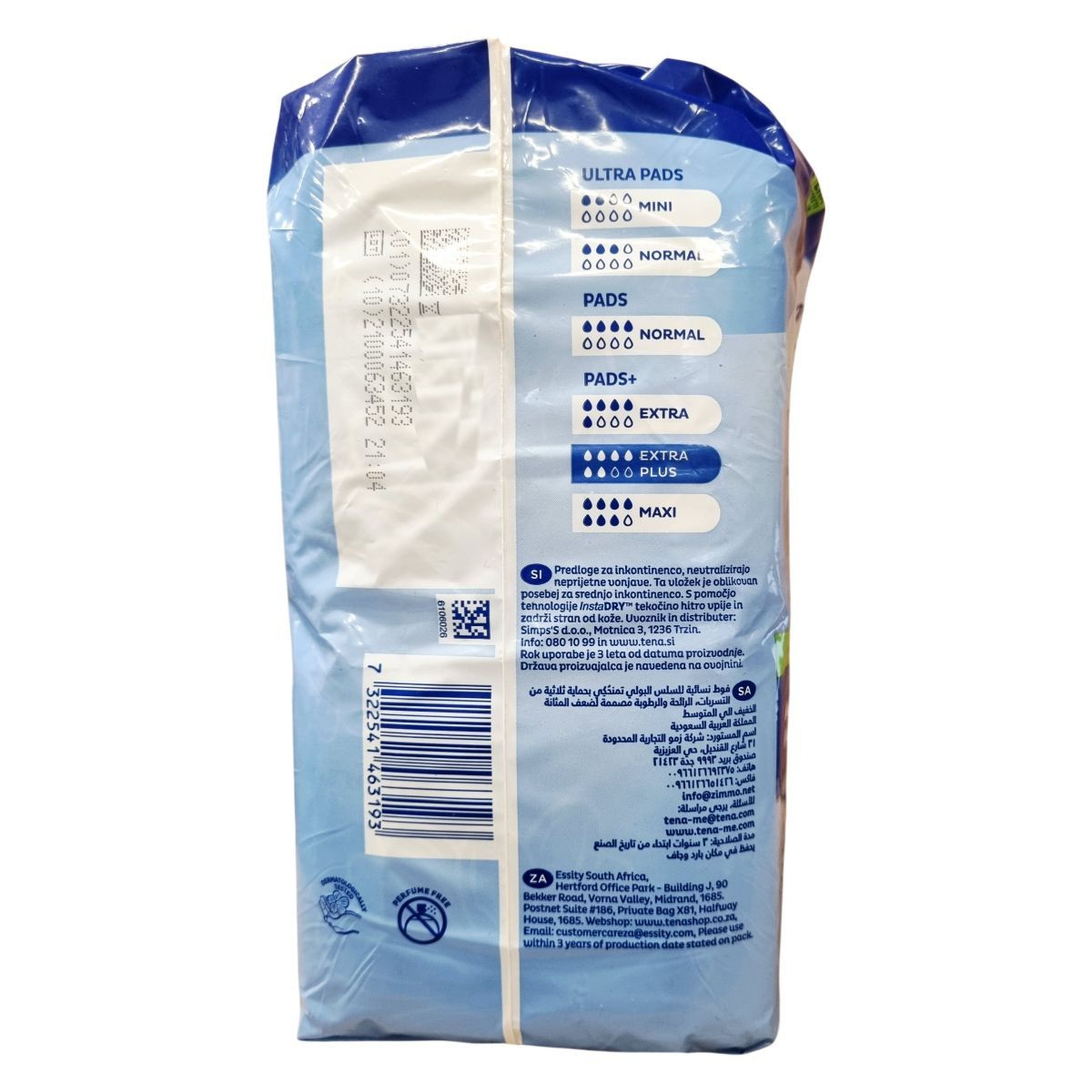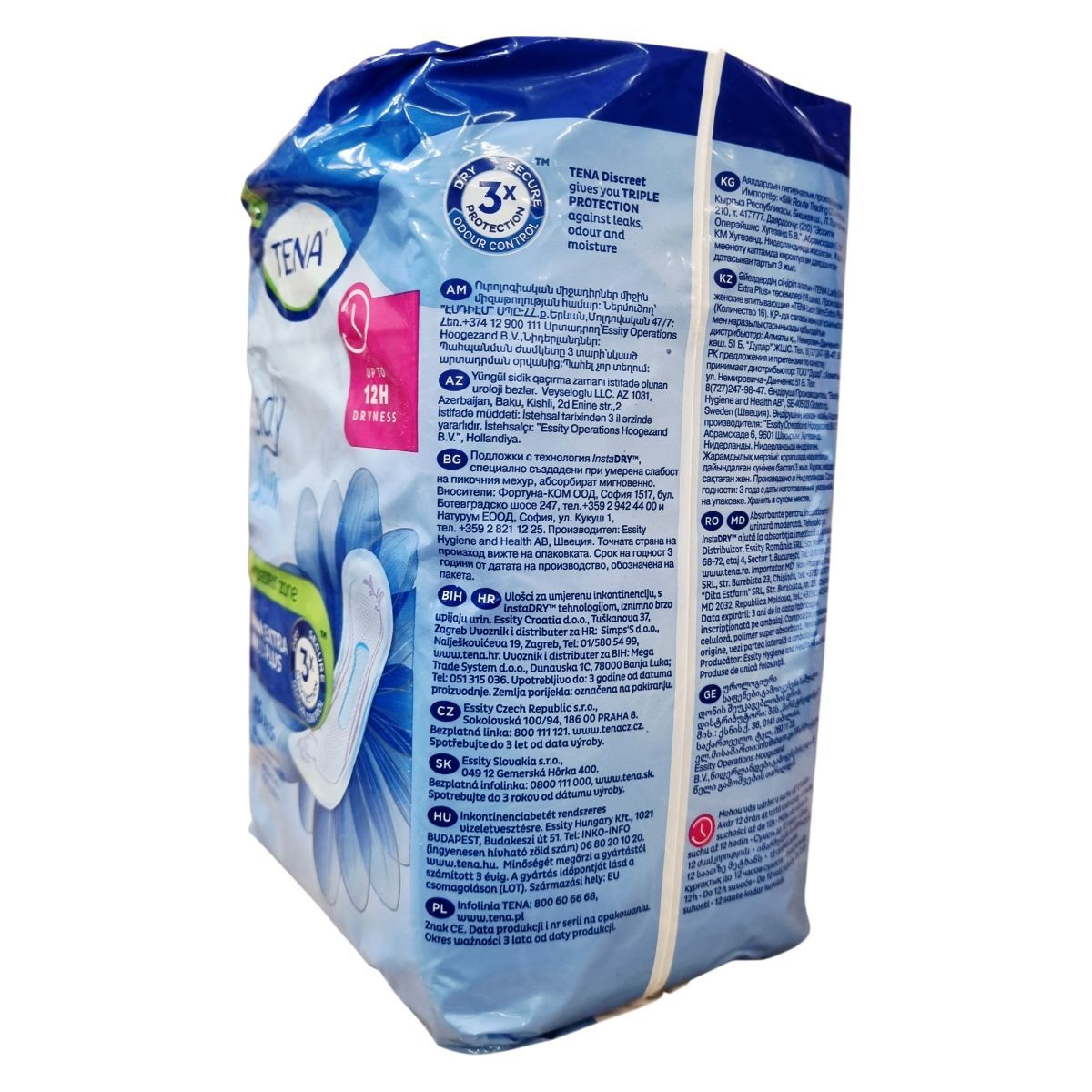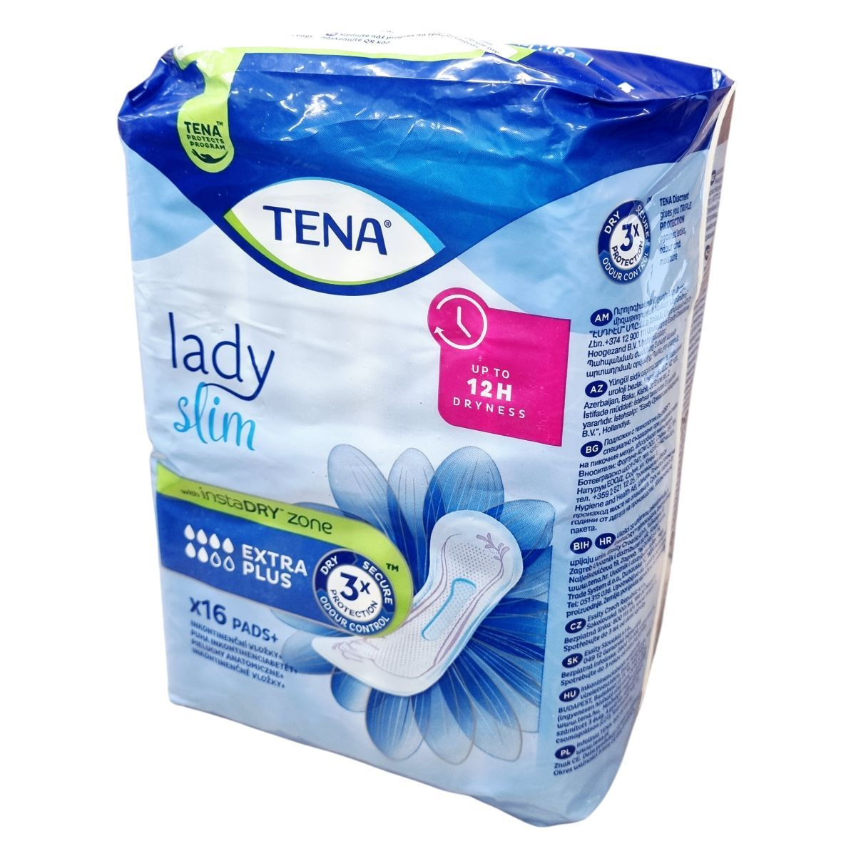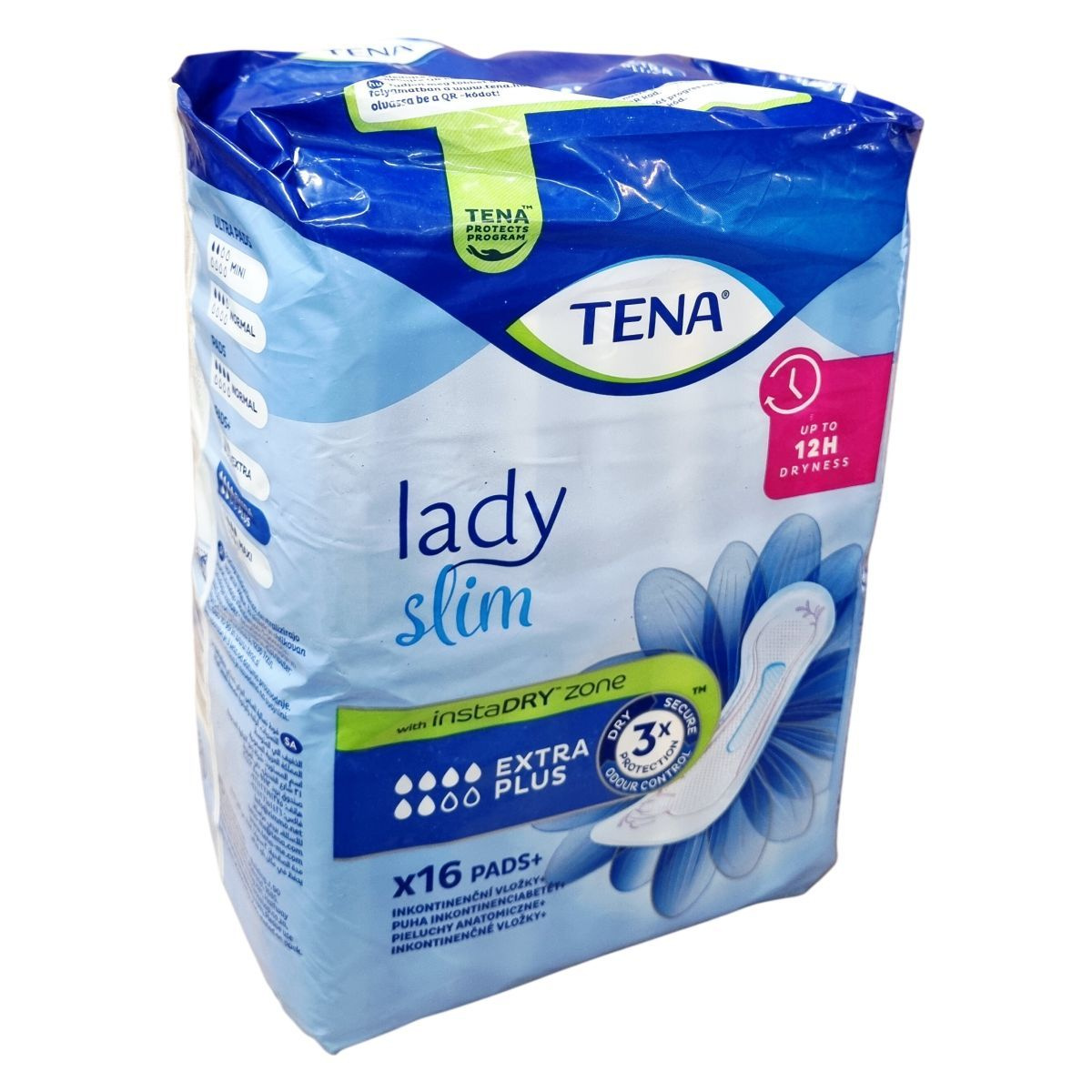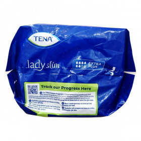 A TENA Lady Slim Extra Plus a TENA Protects Program része, amely folyamatosan törekszik a környezeti lábnyom csökkentésére és az emberek jólétének védelmére. Az instaDRY™ technológia segítségével a betét azonnal magába szívja a nedvességet és mélyen a belső rétegbe zárja, akár 12 órás szárazságot biztosítva. A termék háromszoros védelmet nyújt a nedvesség, szivárgás és kellemetlen szagok ellen. A csomag 16 betétet tartalmaz, amelyek kifejezetten női anatómiai igényekhez igazítottak, így kényelmes viseletet és biztos védelmet nyújtanak középsúlyos vizeletszivárgás esetén. A termék több nyelven is elérhető, és az Európai Unióban készült, a gyártó székhelye Svédország, a gyártás helye Hollandia. A termék használata egyszerű, és a csomagolás megfelelő tájékoztatást nyújt a felhasználóknak. A termék 3 évig megőrzi minőségét a gyártás dátumától számítva. A TENA Protects Program elkötelezett a fenntarthatóság mellett, és folyamatosan fejleszti termékeit környezetbarát megoldások érdekében.