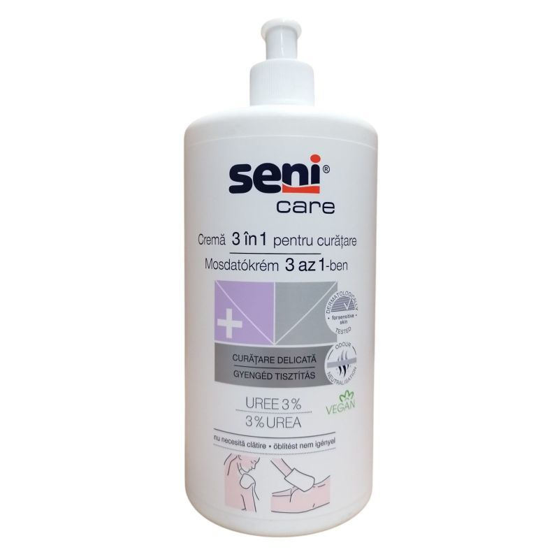 A Seni Care mosdatókrém szappanos-vizes mosdatás helyett használható. Hármas hatással bír: finoman tisztít, táplál és bőrvédelmet is nyújt. Frissítő érzést kölcsönöz a bőrnek anélkül, hogy befolyásolná annak természetes hidrolipid védőrétegét, hatékonyan csökkenti a feszítő érzést a bőrön. Praktikus pumpás adagolóval, mindennapos használatra.