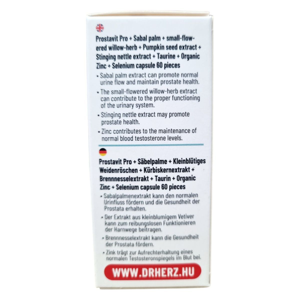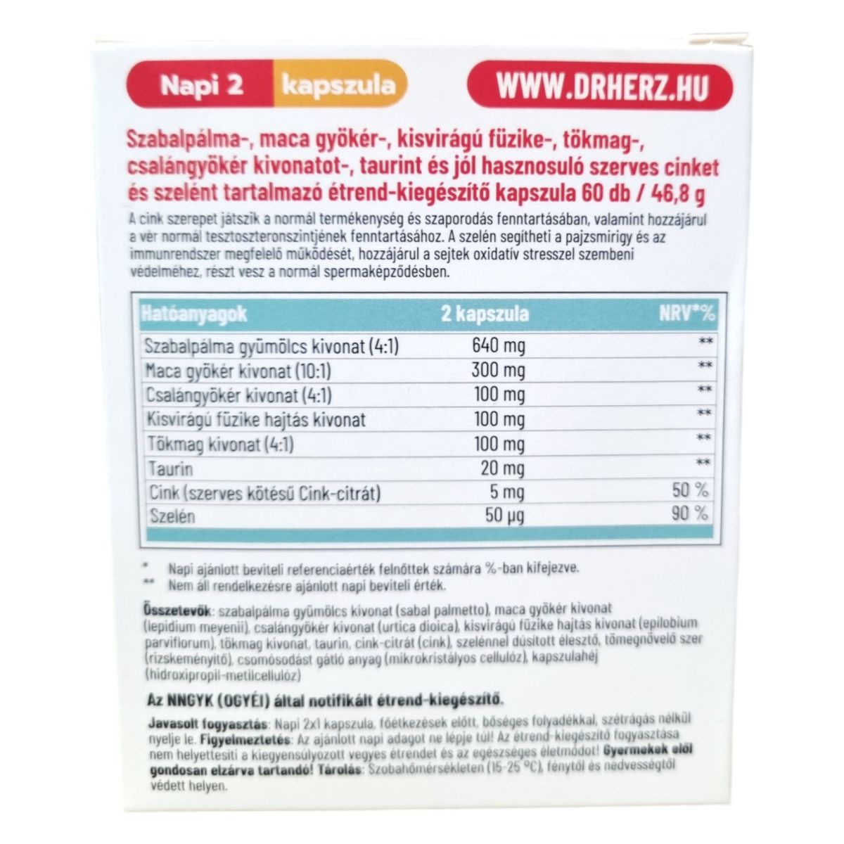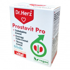 A Dr. Herz Prostavit Pro étrend-kiegészítő kapszula szabalpálma, kisvirágú füzike, tökmag, csalángyökér kivonatot, taurint, valamint szerves cinket és szelént tartalmaz. Ezek az összetevők hozzájárulhatnak a prosztata egészségének fenntartásához, a húgyúti rendszer megfelelő működéséhez, valamint a normál tesztoszteronszint fenntartásához. A termék bio és vegán étrendi irányzatoknak is megfelel. Az étrend-kiegészítő napi ajánlott mennyisége 2 kapszula, amelyet főétkezések előtt, bőséges folyadékkal, szétrágás nélkül kell bevenni.
