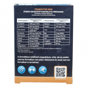 A Trimeszter Men étrend-kiegészítő filmtabletta vitaminok, ásványi anyagok, nyomelemek és egyéb hatóanyagok kombinációját tartalmazza, különösen férfiak számára fejlesztve a normál spermaképződés és termékenység fenntartása érdekében. Új D3-vitamin tartalommal rendelkezik, és allergénmentes összetételű. Szerves kötésű ásványi anyagokat, például magnéziumot, cinket, rezet és szelént is tartalmaz, valamint kalciumot és vasat is szerves formában. Az A-vitamin részt vehet a sejtek differenciálódásában és az immunrendszer működésében, míg a B6-vitamin hozzájárulhat a hormonális aktivitás szabályozásához. A C-vitamin fokozhatja a vas felszívódását, segítheti a kollagén képződését és az immunrendszert intenzív testmozgás alatt. A szelén szerepet játszhat a spermaképződésben és a pajzsmirigy működésében. A cink hozzájárulhat a normál termékenységhez, a tesztoszteronszint fenntartásához, és az immunrendszer védelméhez. A termék támogathatja a sejtosztódást, az egészséges izomfunkciót, valamint a normál energiatermelő anyagcsere-folyamatokat is. Alkalmassá teheti a sportolók számára is a fogyasztását, mivel komplex összetétele révén hozzájárulhat a szervezet egészséges működéséhez.