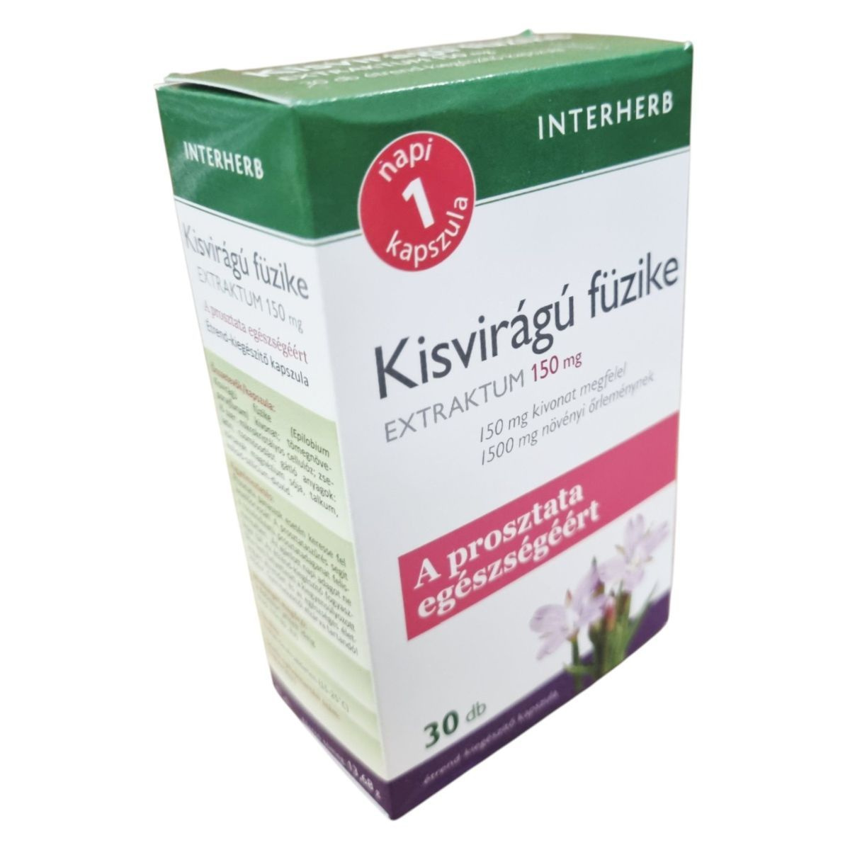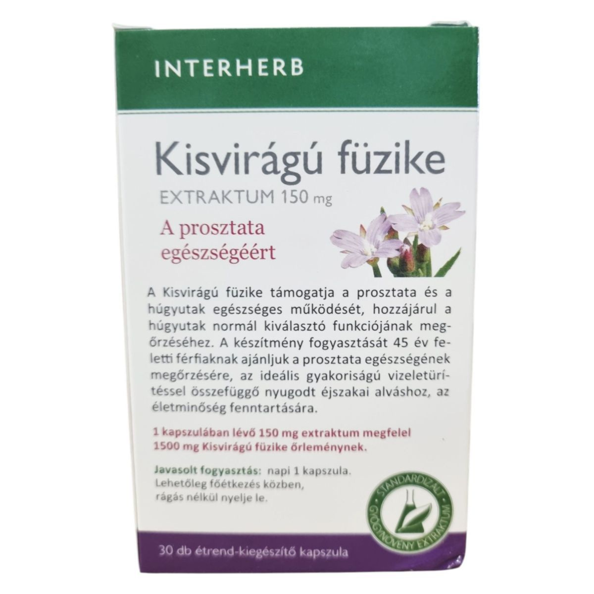 Az INTERHERB Kisvirágú füzike EXTRAKTUM 150 mg kapszula egy standardizált flavonoid hatóanyag tartalmú étrend-kiegészítő, amely a prosztata egészségének támogatására szolgálhat. A termék koncentrált extraktumot tartalmaz, amely 150 mg kivonat formájában 1500 mg növényi őrleménynek felel meg. A megbízható minőséget a bevizsgált alapanyag és a hazai fejlesztés garantálja. A termék 30 db kapszulát tartalmaz, és a gyártási szám a dobozon van feltüntetve.