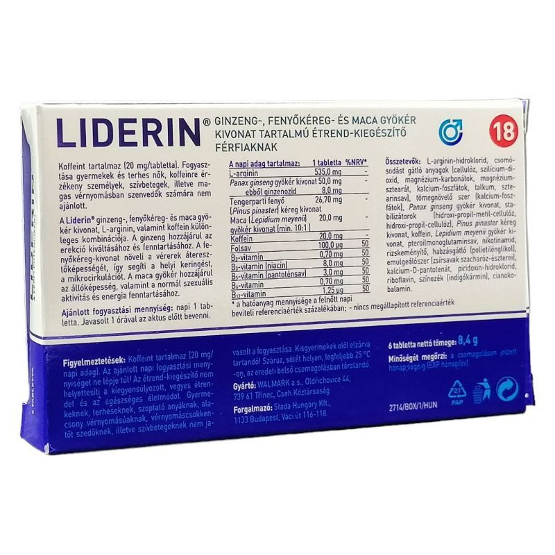 A napi adag tartalmaz: 1 tabletta: L-arginin 535,0 mg, panax ginseng gyökér kivonat: 50,0 mg -ebből ginzenozid: 8,0 mg, tengerparti fenyő (Pinus pinaster) kéreg kivonat 26,70 mg, maca (Lepidium meyenii) gyökér kivonat (min. 10:1 ): 20,0 mg, koffein: 20,0 mg, folsav: 100,0 µg, B2-vitamin: 0,70 mg, B3-vitamin (niacin): 8,0 mg, B5-vitamin (pantoténsav): 3,0 mg, B6-vitamin: 0,70 mg, B12-vitamin 1,25 µg.