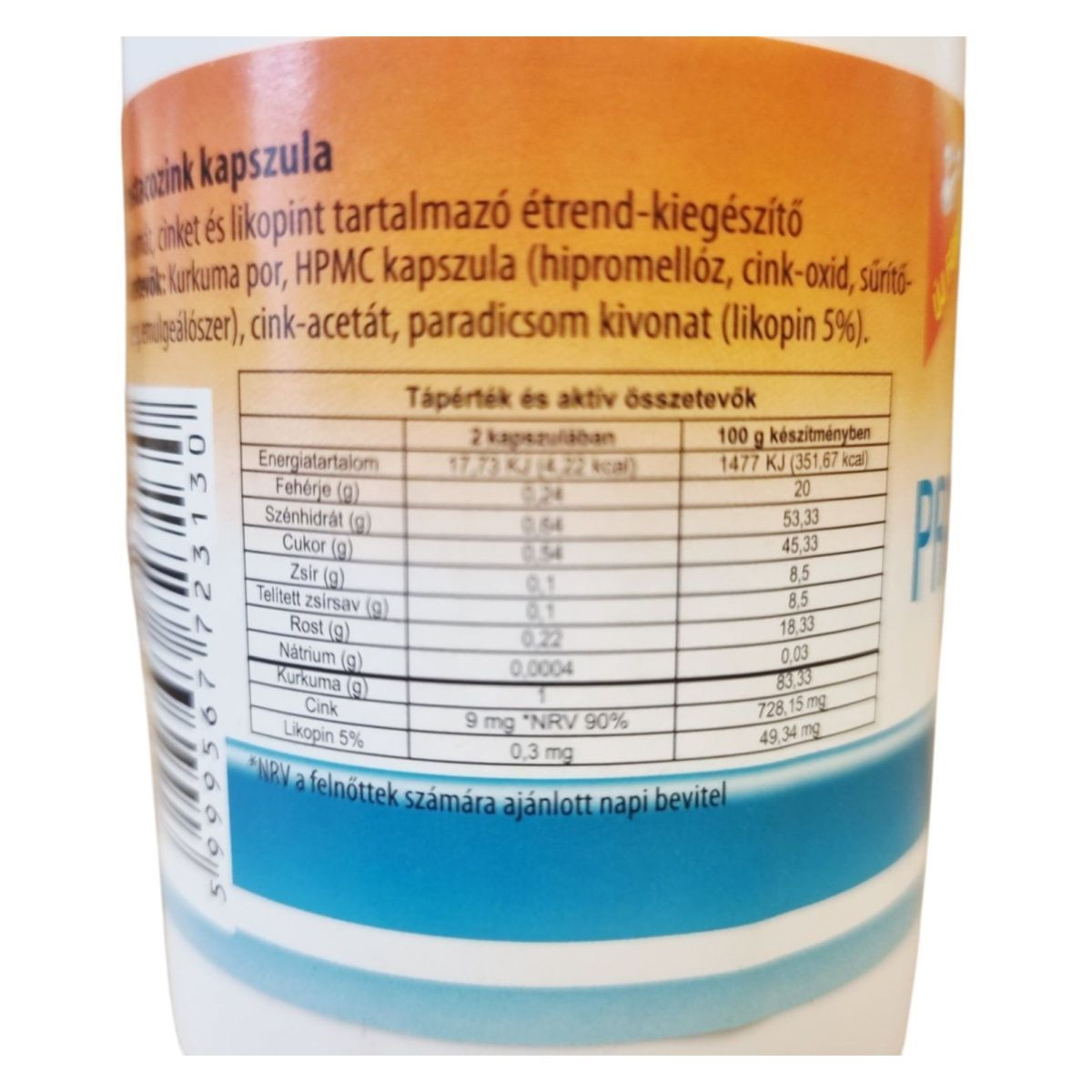 Kurkuma: 0,0004 g, Cink: 9 mg (NRV 90%), Likopin 5%: 0,3 mg